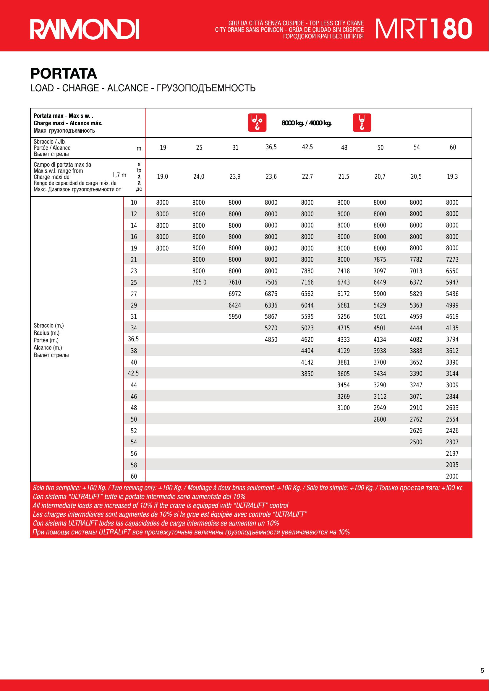 Raimondi MRT 180 в усиленной конфигурации с грузоподъёмностью 10 тонн. Увеличенный вылет стрелы до 60 м и высота подъёма до 100 м позволяют работать на высотных объектах. Кран оснащён системой ULTRALIFT, многоскоростной лебёдкой и современной системой управления. Подходит для крупных жилых и коммерческих объектов.