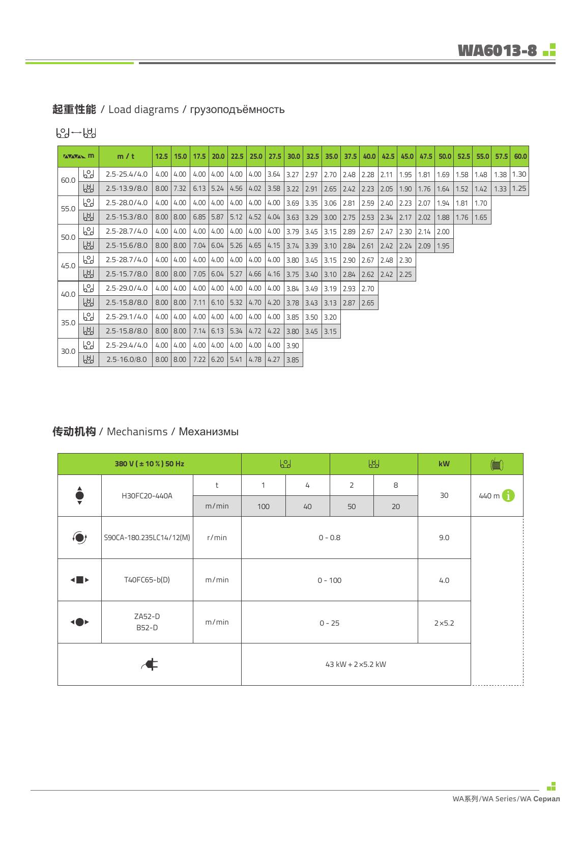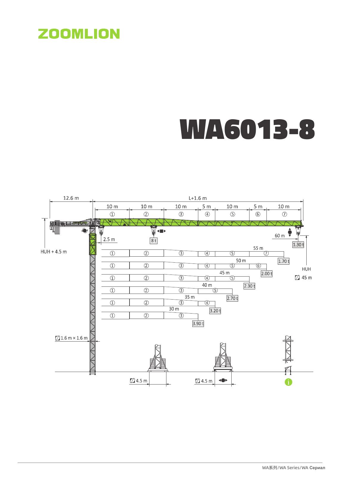 Новый башенный кран Zoomlion WA 6013-8 — высокопроизводительный безоголовочный кран с вылетом стрелы 60 м. Грузоподъёмность на конце стрелы 1,30 т, максимальная — 8 т. Диапазон высот мачты от 30 до 60 м (свободностоящий) и до 216 м в приставном варианте. Идеальное решение для строительства многоэтажных жилых комплексов.